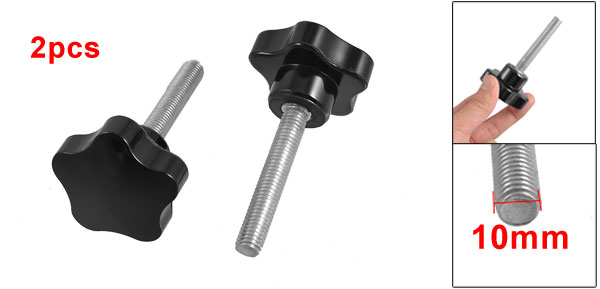 Product Name Star Knob Type Screw On Head Size 48.5 x 44 x 16mm/ 1.9" x 1.7" x 0.6"(L*W*T) Thread Length 60mm/ 2.4" Male Thread Diameter 10mm/ 0.39" Total Height 90mm/ 3.5" Material Metal, Plastic Color Silver Tone, Black Weight 158g Package Content 2 x Star Knob - Reviews