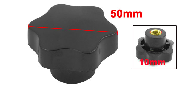 Product Name Star Knob Type Screw On Top Diameter 50mm /2" Bottom Diamter 27mm/1.1" Female Thread Diameter 10mm / 0.4" Total Height 34mm / 1.3" Material Bakelite, Brass Main Color Black Weight 49g Package Content 1x Star Knob - Reviews