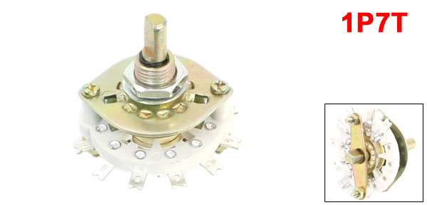 Product Name Rotary Switch Model KCZ-1x7 Contact Type 1 Pole 7 Position(1P7T), 1 Deck Fit Mounting Hole Diameter 10mm / 0.39" Rotating Shaft Dia 6mm / 0.24" Pin Number 8 Dimensions 3.8 x 4.5cm / 1.5" x 1.8"(Max.D*H) Material Metal, Ceramic Net Weight 35g Package Content 1 x Rotary Switch - Reviews