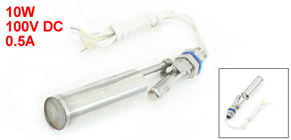 Product Name Floating Switch Model No. ZSC11 Max Contact Rating 10W Max Switching Voltage 100V DC Max Switching Current 0.5A Max Breakdown Voltage 220V DC Max Carry Current 1A Max Contact Resistance 100mΩ Max Temperature -30°C - +120°C Material Stainless Steel, SUS Thread Dia(Approx) 10mm / 0.39" Thread Length 15mm / 0.59" Switch Total Length 115mm / 4.5" Cable Length 34cm / 13.4" Color Silver Tone Net Weight 33g Package Content 1 x Floating Switch - Reviews