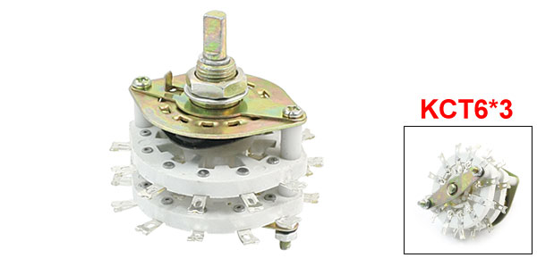 Product Name Rotary Switch Model KCT6*3 Material Metal, Plastic Dimensions(knob not included) 55 x 55mm / 2.2" x 2.2"(Max.D*H) Fit Mounting Hole Diameter 10mm / 0.4" Shaft Diameter 6mm/0.24" Pin Number 24 Contact Type 6 Pole 3 Position Total Weight 60g Package Content 1 x Rotary Switch - Reviews