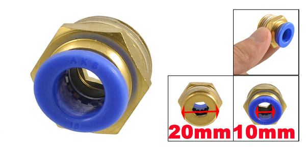 Item Name Quick Fittings Material Solid Brass, Plastic Color Gold Tone, Blue Thread Size 1/2" PT Thread Diameter 20mm Inner Diameter (Blue End) 10mm/ 0.39" Total Size 20 x 21mm/ 0.79" x 0.83" (L*Max. D) Weight 22g Package Content 1 x Quick Fittings - Reviews