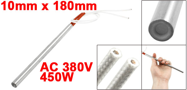 Product Name Cartridge Heater Material Stainless Steel, PVC, Nylon Rated Voltage AC 380V Power 450W Heater Size (Approx.) 10 x 180mm / 0.39" x 7.1" (D * L ) Wire Length (Approx.) 33cm / 13" Color Silver Tone, Red, White Weight 71g Package Content 1 x Cartridge Heater - Reviews