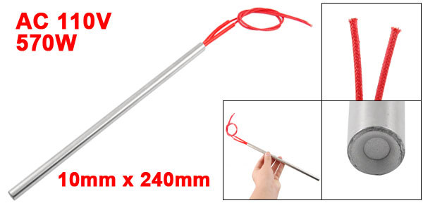 Product Name Cartridge Heater Material Stainless Steel, PVC, Nylon Rated Voltage AC 110V Power 570W Heater Size (Approx.) 10 x 240mm/0.4'' x 9.4'' (D * L) Wire Length (Approx.) 285mm / 11.2" Color Red, Silver Tone Weight 86g Package Content 1 x Cartridge Heater - Reviews