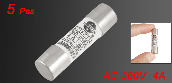 Product Name Cylindrical Fuse Link Material Metal, Ceramic, Electronic Parts Rated Voltage AC 380V Rated Current 4A Rated Breaking Capacity 100KA Dimensions 10 x 38mm/0.39" x 1.49"(Dia*L) Main Color White, Silver Tone Net Weight 34g Package Content 5 x Cylindrical Fuse Link - Reviews