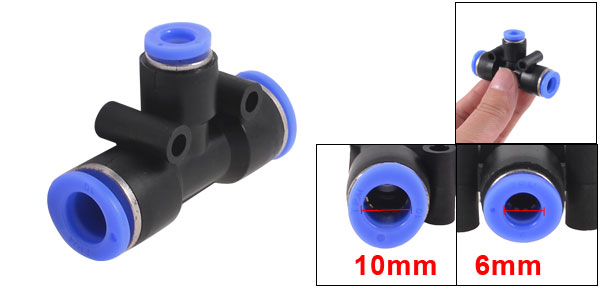 Product Name Quick Fittings Design Tee Shaped Connector Type 10mm to 6mm Material Plastic Dimension (Approx) 55 x 35 x 18mm/ 2.1" x 1.3" x 0.7" (L*W*H) Color Black, Blue Weight 55g Package Content 4 Pcs x Quick Fittings - Reviews