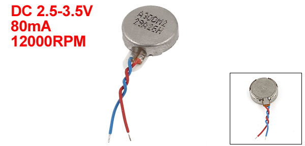 Product Name DC Vibration Motor Material Metal Rated Voltage Current DC 2.5-3.5V 80mA Speed 12000RPM Size 10 x 3mm / 0.4" x 0.12"(D*H) Color Silver Tone Weight 2g Package Content 1 x DC Vibration Motor - Reviews