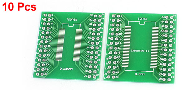 Product Name SOP56 SSOP56 TSSOP56 Adapter Plate Pin Pitch 0.635mm/0.8mm,2.54mm/0.1" Body Size 37 x 36 x 1.6mm/1.5" x 1.5" x 0.06"(L*W*T) Material FR-4, Electronic Part Main Color Green Net Weight 33g Package Content 10Pcs x SOP56 SSOP56 TSSOP56 Adapter Plate - Reviews
