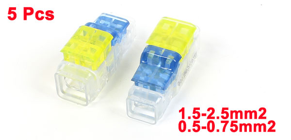 Product Name I-Clamp Wire Connector Connector Type Push in Type Pin Number 2 Material Plastic Color Yellow, Clear Blue Fit Cable 1.5-2.5mm2 to 0.5-0.75mm2 Total Size 4.5 x 1.6 x 2.1cm/1.8" x 0.63" x 0.83"(L*W*H) Net Weight 43g Package 5 x I-Clamp Wire Connector - Reviews