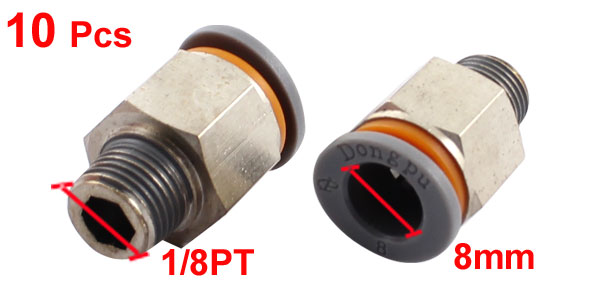 Product Name Quick Coupler Model PC08-01 Male Thread 9.5mm/ 1/8PT Male Thread Length 6mm Fit Tube OD 8mm Overall Size 16 x 23mm /0.63" x 0.91"(D*L) Color Silver Tone, Gray Material Metal, Nylon Net Weight 94g Package Content 10 x Quick Coupler - Reviews