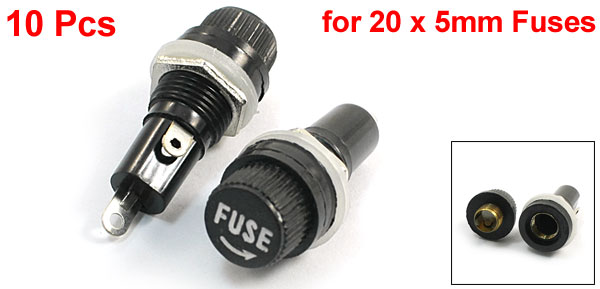 Item Name Panel Mounted Fuse Holder Fit for 20 x 5mm Fuses Material Plastic ,Metal Rated Voltage AC 10A 250V Color Black, Silver Tone Size 38 x 16mm/ 1.5" x 0.63" (L*D) Panel Cut Dia 11mm/0.43" Net Weight 53g Package Content 10 x Panel Mount Fuse Holder - Reviews