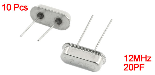 Product Name Passive Crystal Oscillator Output Frequency 12MHz Load Capacitance 20PF Frequency Tolerance ±20ppm Mounting Type DIP Pins Number 2 Color Silver Tone Each Size 16 x 11 x 4.5mm/ 0.63" x 0.43" x 0.18"(H*L*W) Weight 6g Package Content 10 x Passive Crystal Oscillator - Reviews