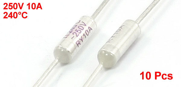 Product Name Thermal Fuse Rating 250V 10A Cutoff Temperature 240°C Fuse Size 4 x 13 mm / 0.16" x 0.51" (D*L) Total Length 6.5cm / 2.6" Main Material Aluminum Fuse, Metal Leads Color Silver Tone, Beige Weight 10g Package 10 x Thermal Fuse - Reviews