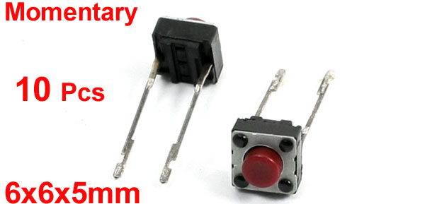 Product Name Tact Switch Action Type Momentary Pin Number 2 Total Size(Pin No Include) 6 x 6 x 5mm/0.24" x 0.24" x 0.2"(L*W*T) Button Size 3.5 x 12mm/0.14" x 0.47"(D*H) Foot Length 14mm/0.55" Material Plastic, Metal Color Black, Silver Tone Net Weight 3g Package Content 10 x Tact Switch - Reviews