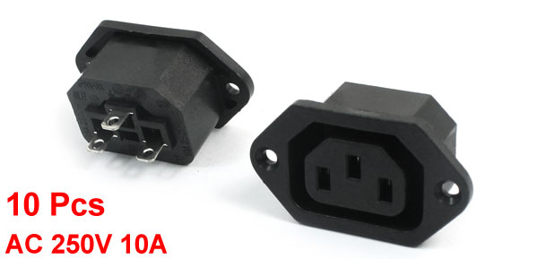 Details10Pcs 3 Soldering Pins Power Supply C13 Coupler Female Plug AC 250V 10A  Product Name Power Socket Socket Type C13 Power Supply AC 250V 10A Pin Number 3 Top Size(Approx.) 49 x 28mm / 1.9" x 1.1" (L * W ) Mount Size(Approx.) 32 x 23 x 26mm / 1.2" x 0.9" x 1" (L * W * Depth) Material Plastic, Metal Color Black Weight 141g Package Content 10 x Power Sockets