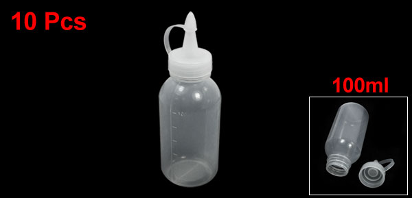 Details10Pcs 3.4oz 100ml White Plastic Cap Oil Water Measuring Bottles Liquid Container  Product Name Measuring Bottle Material Plastic Color Clear White Capacity 3.4oz 100ml Size 13 x 4.5cm/5.1" x 1.8" (H*D) Net Weight 130g Package Content 10 x Measuring Bottle