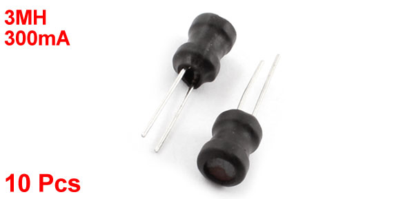 Product Name Radial Lead Inductor Inductance 3mH Rating Current 300mA Tolerance 10% Body Size 6 x 8mm / 0.24" x 0.31"(D*H) Lead Distance 3mm / 0.12" Color Black, Silver Tone Weight 10g Package Content 10 x Radial Lead Inductor - Reviews