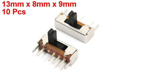 Life Test 10000 cycles/ minute Pin Pitch 1.5mm / 0.06" 3.5mm / 0.14" Main Body Size(not include Pins & Knob) 13 x 4.5 x 4.5mm/ 0.51" x 0.18" x 0.18" (L*W*H) Overall Size 13 x 8 x 9mm/ 0.51" x 0.31" x 0.35" (L*W*H) Knob Size 2 x 2 x 5mm/ 0.079" x 0.079" x 0.2" (L*W*H) Material Plastic, Metal, Electronic Parts Color Silver Tone, Black Weight 8g Package 10 x Slide Switch - Reviews