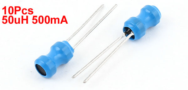Product Name Radial Lead Inductor Inductance 50uH Rating Current 500mA Tolerance 10% Body Size 4 x 6mm / 0.16" x 0.24"(D*H) Lead Distance 2mm / 0.08" Color Blue, Silver Tone Weight 4g Package Content 10 x Radial Lead Inductor - Reviews