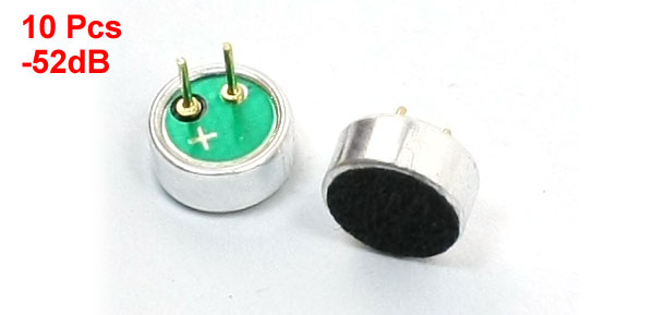 Product Name Omni-Directional Electret Condenser Microphone Sound Channel Number Stereo Output Impedence 2kOhm Frequency Response 20kHz Microphone Unit 6027 Sensitivity -52dB Body Size 6 x 3mm / 0.24" x 0.12" (D*T) Pin Pitch 2mm / 0.08" External Material Alumnium Main Color Silver Tone, Black, Green Weight 2g Package Content 10 x Omni-Directional Electret Condenser Microphone