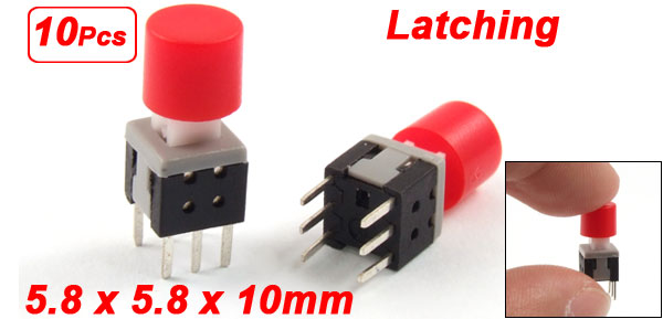 10pcs 5.8 x 5.8mm x 10mm Latching Tactile Push Button Switch Self Lock w Red Cap