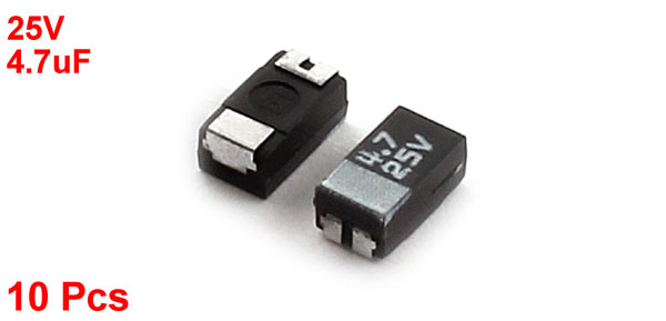 Details10PCS 6032 Case C 4.7uF 25V 6mmx3mmx2.5mm SMT SMD Tantalum Chip Capacitors  Product Name Chip Tantalum Capacitor Rated Voltage 25V Capacity 4.7uF Type 475 C Type Each Size(Approx.) 6 x 3 x 2.5mm/ 0.24" x 0.12" x 1"(L*W*T) External Material Tantalum, Metal Weight 3g Package Content 10 Pcs x Chip Tantalum Capacitor
