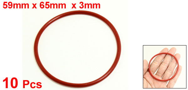 Product Name Rubber O Ring Material Rubber Inside Diameter 59mm / 2.32" Outside Diameter 65mm / 2.56" Thickness 3mm / 0.12" Color Red Weight 18g Package Content 10 x Rubber O Rings - Reviews