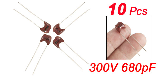 Product Name Mica Capacitor Dielectric Material Mica Capacitance 680pF Tolerance ±5% Withstand Voltage 300V Body Dimension 8 x 7 x 3mm/0.3" x 0.27" x 0.11"(W*H*T) Lead Length 28mm/1.1" Lead Pitch 6mm/0.24" Color As Picture Shown Net Weight 6g Package Content 10 x Mica Capacitors - Reviews