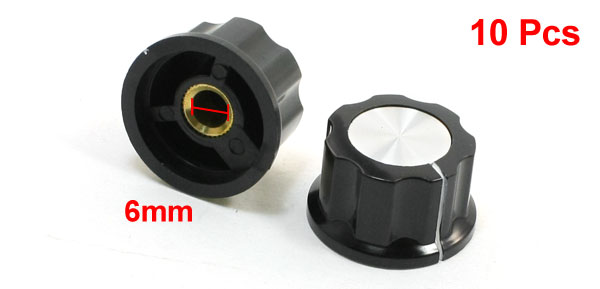 Product Name Potentiometer Control Knob Knob Top Diameter 23mm / 0.9" Knob Base Diameter 26mm /1" Shaft Insert Diameter 6mm / 15/64" Knob Total Height 15mm / 0.6" Material Plastic, Metal Main Color Black, Silver Tone Weight 65g Package Included 10 x Potentiometer Control Knob - Reviews