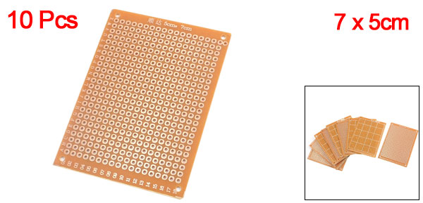 Product Name Universal PCB Board Hole Dia(Approx) 1mm / 0.039" Hole Pitch(Approx) 2.54mm / 0.1" Size(Approx) 7 x 5cm / 2.75" x 2"(L*W) Thickness(Approx) 1.15mm / 0.04“ Material FR-4 Color Copper Tone Weight 47g Package Content10 10 x Universal PCB Board - Reviews