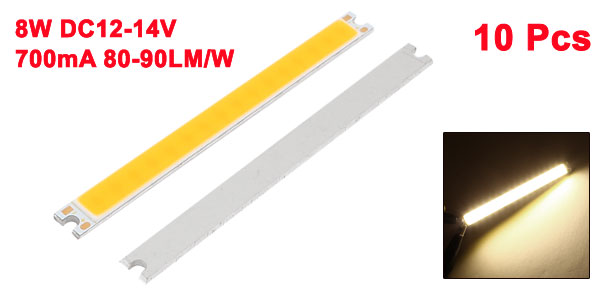 Product Name COB LED Lamp Beads Rated Voltage DC12-14V Luminous Flux 80-90LM/W Color Temperature 2800-3000K Power 8W Current 700mA Light Color Warm White Material Aluminum Color Silver Tone, Orange Size 100 x 8mm/ 3.9" x 0.3" (L*W) Luminous Surface 90 x 8mm/ 3.5" x 0.3"(L*W) Weight 57g Package Content 10 x COB LED Lamp Beads - Reviews