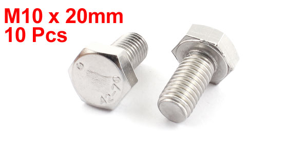 Product Name Hex Head Cap Screw Material A2-70 Stainless Steel Type M10 x 20mm Thread Dia 10mm/ 0.39"(M10) Thread Length 20mm / 0.79" Head Dia 19mm / 0.75" Color Silver Tone Weight 216g Package Content 10 x Hex Head Cap Screw - Reviews