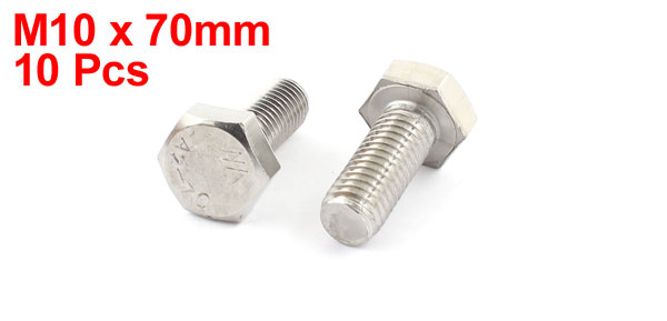 Product Name Hex Head Cap Screw Material A2-70 Stainless Steel Type M10 x 70mm Thread Dia 10mm/ 0.39"(M10) Thread Length 25mm / 1.0" Head Dia 19mm / 0.75" Color Silver Tone Weight 246g Package Content 10 x Hex Head Cap Screw - Reviews
