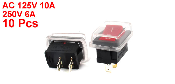 Details10PCS AC 125V/10A 250V/6A SPST ON/OFF 2 Pins Waterproof Rocker Switch  Main Color Red, Black Product Name Waterproof Rocker Switch Brand DMiotech Net Weight 44g Total Size(Each) 27 x 26 x 18mm/ 1.1" x 1.1" x 0.7"(L*W*H) Positions Number 2 Country of Manufacture CHINA Model KCD-117 Package Content 10 x Waterproof Rocker Switches Voltage/Current AC 125V/10A 250V/6A Connection Type SPST Material Plastic, Metal