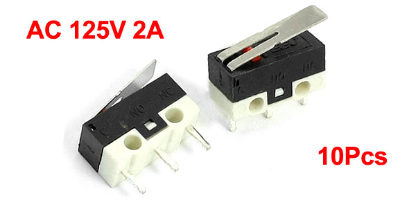 Product Name Micro Limit Switch Model KW10 Voltage & Current AC 125V 2A Poles SPDT Contact Type 1NO + 1NC Actuator Type Short Hinge Lever Terminal Type 3 Pin Terminals Overall Size(Pin not included) 13 x 6 x 6.3mm / 0.5" x 0.24" x 0.25" (L*W*H) Mounting Hole Dia. 2mm / 0.08" Mounting Hole Spacing 6mm/ 0.2" Pin Size 3 x 0.8mm/ 0.12" x 0.03"(L*W) Push Button Size 3 x 1mm / 0.12" x 0.04" (L*W ) Material Plastic, Metal Color Black, White Total Weight 6g Package Content 10 x Micro Limit Switches - Reviews