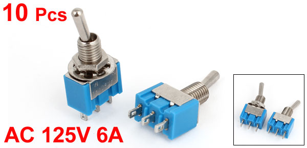 Product Name Toggle Switch Color Blue & Silver Tone Power AC 125V 6A Position 2 Position(ON/ON) Pins 3 Type SPDT(Latching) Total Size 13 x 8 x 33mm/0.51" x 0.31" x 1.3"(L*W*H) Mounting Thread 5.8mm/0.23" Weight 44g Package Content 10Pcs x Toggle Switch - Reviews