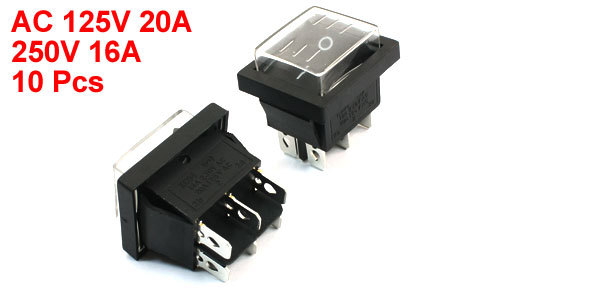 Product Name Waterproof Rocker Switch Connection Type DPDT Terminals Number 6 Positions Number 2(I/O) Voltage/Current AC 125V/20A 250V/16A Total Size(Each) 35 x 29 x 36mm/ 1.4" x 1.1" x 1.4"(L*W*H) Mounted Size 30 x 21mm/ 1.2" x 0.83"(L*W) Switch Color Black Button Color Black Material Plastic, Metal Weight 161g Package Content 10 x Waterproof Rocker Switches - Reviews