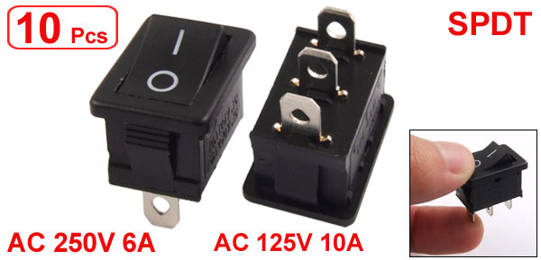 Product Name Rocker Switch Poles SPDT Terminals 3 Pins Position On/On Two Position Rated Voltage AC 250V 6A AC 125V 10A Overall Size 2.1 x 1.5 x 2.45cm / 0.83" x 0.59" x 0.96" (L*W*H) Mounting Size 1.8 x 1.2 x 1.9cm / 0.7" x 0.47" x 0.75" (L*W*H) Color Black, Silver Tone Material Plastic, Metal Total Weight 37g Package Content 10 x Rocker Switches - Reviews