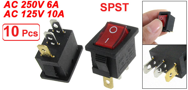 10pcs AC 6A/250V 10A/125V Red Light ON/OFF I/O SPST Snap In Rocker Switch 3 Pin