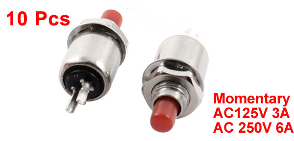 Product Name Push Button Switch Model Type DS402 Action Type Momentary Contact configuration SPST Rating Voltage AC125V 3A AC 250V 6A Pins Quantity 2 Pins Mounting Thread Diameter 5mm / 0.2" Button Diameter 3mm/ 0.12" Overall Size 8 x 22mm/ 0.31" x 0.87"(D*H) Material Plastic, Metal Color Red, Silver Tone Net Weight 18g Package Content 10 Pcs x Push Button Switch - Reviews