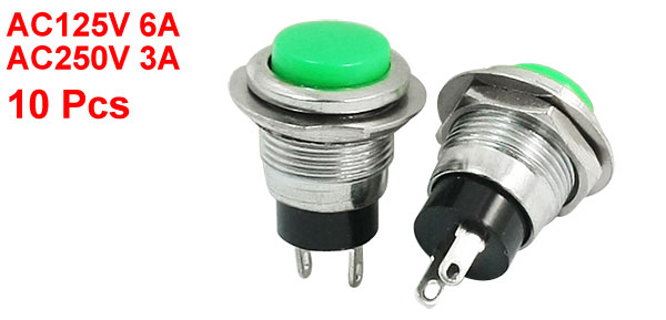 AC250V 3APin Number 2 Contact Type SPST Mounting Hole Diameter 12mm / 0.47" Soldering Distance 5mm / 0.2" Button Head Diameter 10mm / 0.4" Total Size 17 x 24mm / 0.67'' x 0.94''(Max.D*H) External Material Metal Color Green Net Weight 59g Package Content 10 x Push Button Switches - Reviews