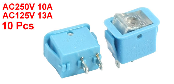 Product Name Rocker Switch Model MJ-11 Poles SPST Action Type Latching Terminals 2 Pin (On-Off) Rating Voltage AC250V 10A, AC125V, 13A Total Size(Each One) 19 x 12 x 21mm/ 0.75" x 0.47" x 0.83"(L*W*T) Mounting Size 17 x 11mm/ 0.67" x 0.43"(L*W) Color Blue Material Plastic, Metal Weight 22g Package Content 10 x Rocker Switches - Reviews