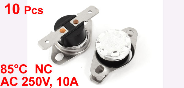 Product Name Temperature Control Switch Model.No KSD301 Action Type Normally Closed(NC) Action Temperature 85°C Voltage & Current AC 250V, 10A Total Size (Each) 34 x 18 x 12mm / 1.3" x 0.71" x 0.47"(L*W*H) Mounting Hole Size 4.5 x 3.5mm/0.18" x 0.14"(L*W) Material Metal, Plastic Color White, Silver Tone Total Weight 47g Package Content 10 x Temperature Control Switches - Reviews