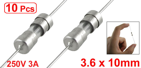 Product Name Axial Fuse Type Slow Blow Rated Power 250V, 3A Body Size 3.6 x 10mm/0.1'' x 0.4''(D*L) Leads Size(Each End) 5 x 28mm/0.2'' x 1.1'' (D*L) Color Silver Tone Material Alloy, Glass Weight 6g Package 10 x Axial Fuse - Reviews