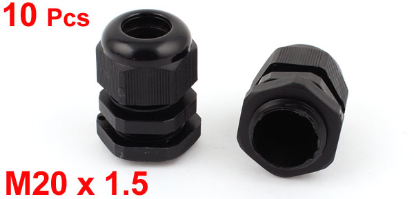 Details10pcs Black Plastic Waterproof Cable Glands Connectors M20 x 1.5  Product Name Cable Gland Model M20 x 1.5 Thread Dia. 20mm/0.8" Thread Length 10 mm / 0.4" Total Size 25 x 35mm/1" x 1.4"(D*L) Material Plastic Color Black Weight 86g Package Content 10pcs x Cable Glands