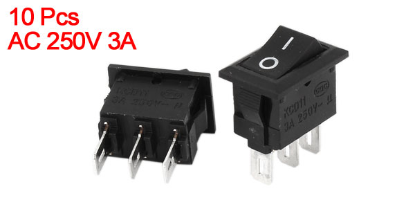 Product Name Rocker Switch Action SPDT Terminals 3 Pin (ON-OFF) Rating Voltage AC 250V 3A Total Size 1.5 x 1.1 x 2cm/ 0.6" x 0.43" x 0.79"(L* W *T) Mounting Dimension 1.3 x 0.8cm/ 0.51" x 0.31"(L*W) Color White, Silver Tone Material Plastic & Metal Total Weight 15g Package Content 10 x Rocker Switch - Reviews