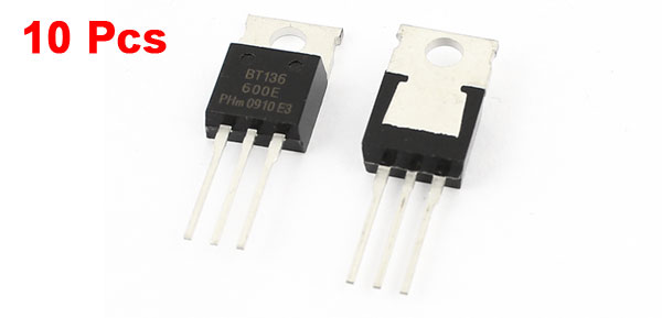 Product Name Triacs Sensitive Gate Model BT136-600E Matrial Metal, Plastic Repetitive Peak off-state voltages 600V RMS on-state current 4A Non-repetitive peak on-state current 25A Packag Type TO-220 Main Color Black, Silver Tone Weight 20g Package Content 10 x Triacs Sensitive Gate - Reviews