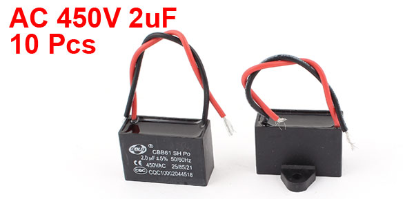 Product Name Motor Capacitor Model CBB61 External Material Plastic Dielectric Material Metalized Polypropylene Film Rated Capacitance 2uF Tolerance +/-5% Frequency 50/60Hz Rated Voltage AC 450V Body Size 38 x 27 x 17mm/ 1.5" x 1.1" x 0.67"(L*W*T) Mount Hole Diameter 4mm/0.2" Cable Length 10cm/ 3.9" Net Weight 206g Package Content 10 x Motor Capacitor - Reviews