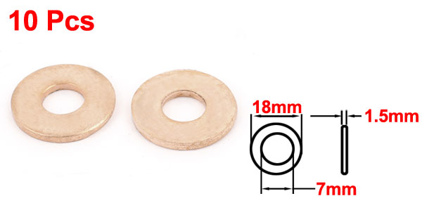 Details10Pcs Copper Crush Washer Flat Ring Seal Gasket Fitting 7mmx18mmx1.5mm  Product Name Copper Washer Inner Diameter 7mm/0.28" Outer Diameter 18mm/0.71" Thickness 1.5mm/0.06" Material Copper Color Copper Tone Weight 28g Package Content 10 Pcs x Copper Washer