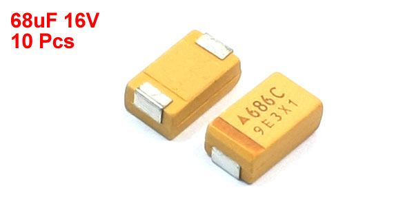 Product Name Chip Tantalum Capacitor Rated Voltage 16V Capacity 68uF Type 7343 D Type Each Size(Approx.) 7.3 x 4.3 x 3mm/ 0.29" x 0.17" x 0.12"(L*W*T) External Material Tantalum, Metal Weight 4g Package Content 10 Pcs x Chip Tantalum Capacitor - Reviews